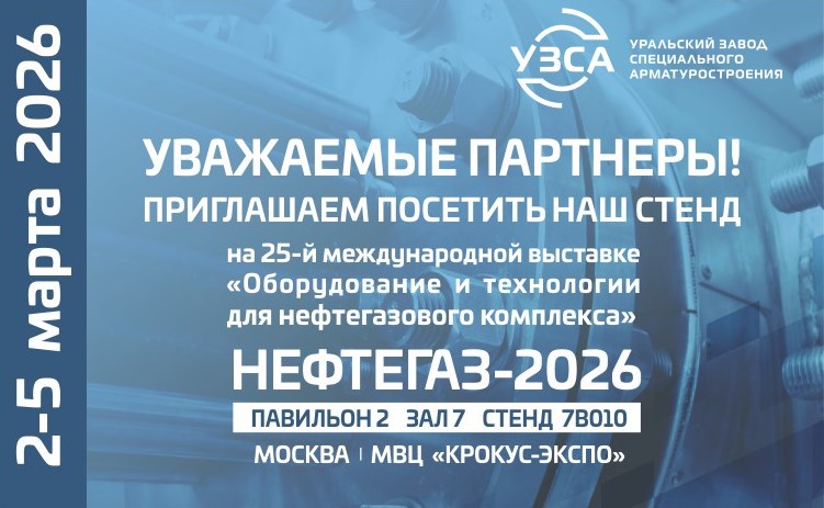 С 2 по 5 марта 2026 года ООО «Уральский завод специального арматуростроения» примет участие в 25-й Международной выставке «Оборудование и технологии для нефтегазового комплекса» - «НЕФТЕГАЗ-2026», которая состоится в Московском международном выставочном центре «Крокус Экспо».